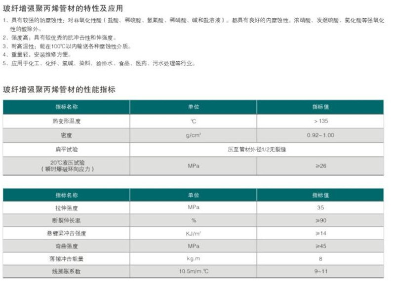與傳統(tǒng)的金屬管材相比較,PP管具有較強(qiáng)的耐酸堿耐腐蝕性能,對多數(shù)非氧化性酸都具有良好的耐腐蝕性;除一些強(qiáng)氧化性酸。FRPP材質(zhì)有較優(yōu)良的抗沖擊性和拉伸強(qiáng)度。PP管耐高溫,重量輕,運(yùn)輸、安裝、維修方便,性價(jià)比高。